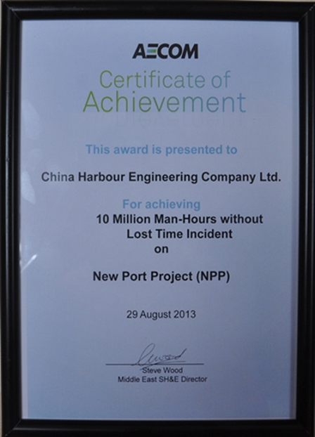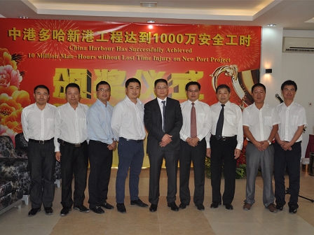 2013年8月28日,多哈新港项目安全管理再创佳绩,顺利实现10005695安全工时,9月12日,多哈新港项目1000万安全工时庆典仪式在多哈新港项目部举行,中国驻卡塔尔国特命全权大使高有祯、业主多哈新港项目管理委员会执行董事Nabeel Mohammed Al-Buenain、咨工AECOM中东区域公司经理Tim Verdon出席了此次庆典仪式。