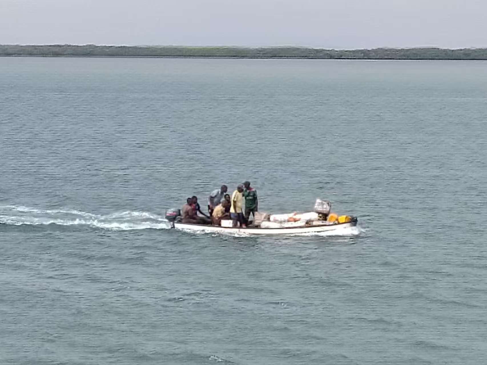 2025年12月25日9时50分左右,项目值班船员廖武明在基卢瓦渔港附近水域巡查时,突然听见不远处传来一阵急促而断续的呼救声,循声望去,一艘载着十余名乘客与一批货物的渡船向左倾斜,海水不断从船尾涌入,船体在缓慢下沉。“不好,有船遇险!”廖武明立即向项目部领导报告情况。