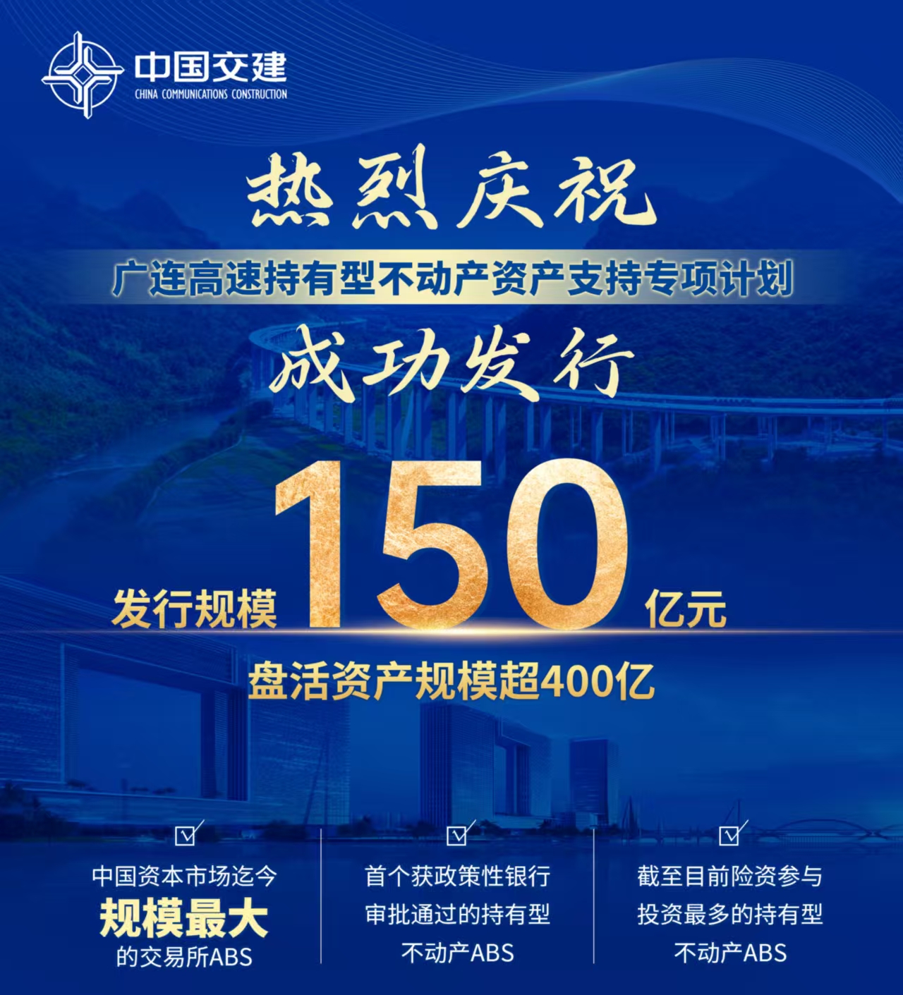 近日,广连高速持有型不动产资产支持专项计划在上海证券交易所成功发行。广连高速不动产ABS项目发行规模达150亿元,盘活资产规模估值超400亿。本交易创下多项市场记录:规模最大的存量基础设施资产盘活交易、发行规模最大的企业ABS的持有型不动产ABS。同时,也创下企业成本最低的持有型不动产ABS、首单获政策性银行审批通过的持有型不动产ABS 等记录,也是四航局通过金融创新盘活存量资产的最新成果。